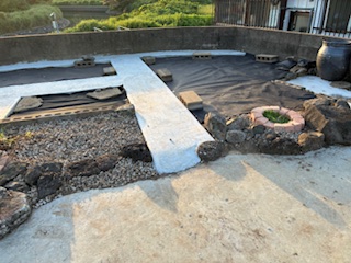 除草シートに砂利を敷いて5年、草取りは楽になりましたが雑草には負けました。根気が続かずセメントをすることに。